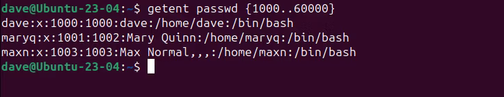 有了这些知识,我们就可以使用 getent 命令在密码数据库中搜索值在 1000 到 60000 范围内的条目。