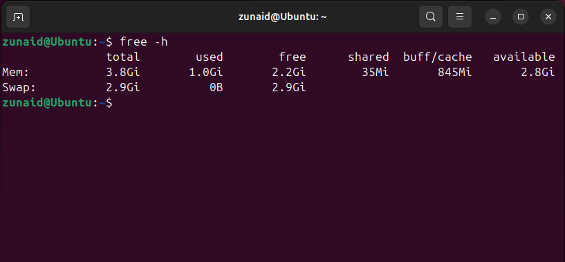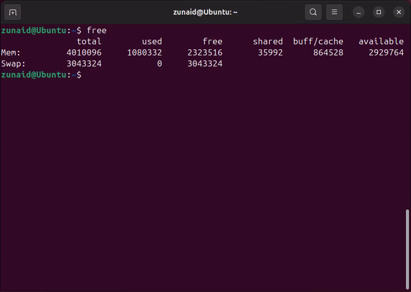free 命令用于检查系统的 RAM 使用情况。这还包括交换内存。只需运行这样的命令:
