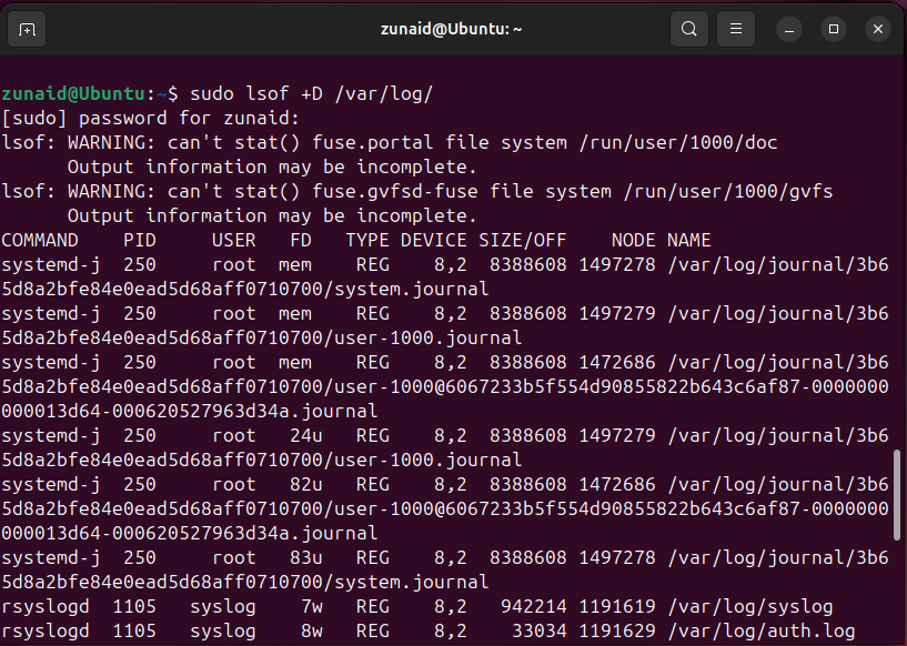 lsof 命令可以帮助您找到哪些进程正在使用哪些文件,以便您可以正确地处理它们。