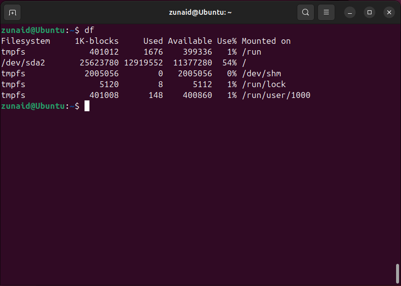 df命令用于分析磁盘空间使用情况。它为您提供总磁盘空间和可用磁盘空间的概览。您可以按原样运行该命令。