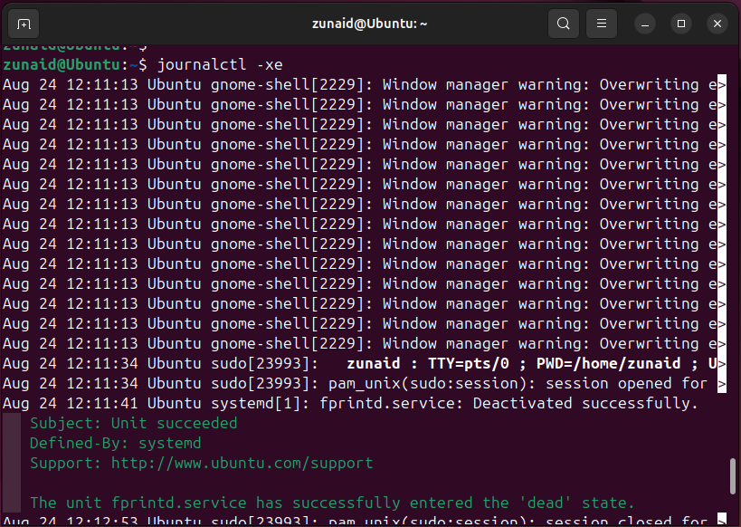 dmesg 命令是打印 Linux 内核环形缓冲区消息的强大工具。这些消息通常包括系统启动消息和硬件错误。使用 sudo 运行命令,如下所示:
