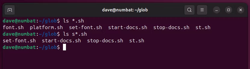 第一个命令列出目录中的所有 shell 脚本文件。第二个命令仅列出以“s”开头的文件,这些文件也是 shell 脚本文件。