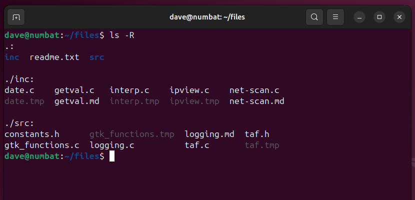 在本例中,我们将使用一个包含单个文件的目录,名为 readme.txt。有两个目录,src 和 inc。它们包含 C、H、MD 和 TMP 文件的混合。