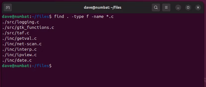 我们可以使用 find 递归地查找名称与我们的模式 (-name *.c) 匹配的文件 (-type f),从而为我们提供 C 文件的列表。