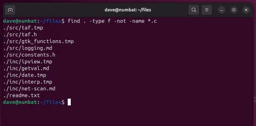 我们可以添加 -not 选项来反转搜索,向我们显示除 C 文件之外的所有内容。