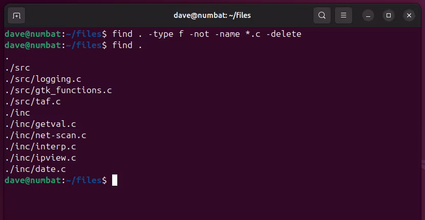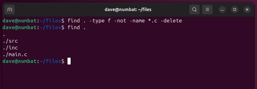 我们将使用相同的 find 命令和选项来删除除 C 文件之外的所有内容。这根本不是我们想要的。