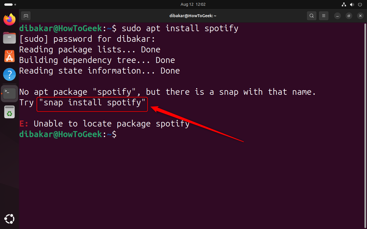 这是我尝试在 Ubuntu 上安装 Spotify 的情况。正如您所看到的,Ubuntu 告诉我使用 snap,因为它在 Ubuntu 存储库中不作为 DEB 提供。