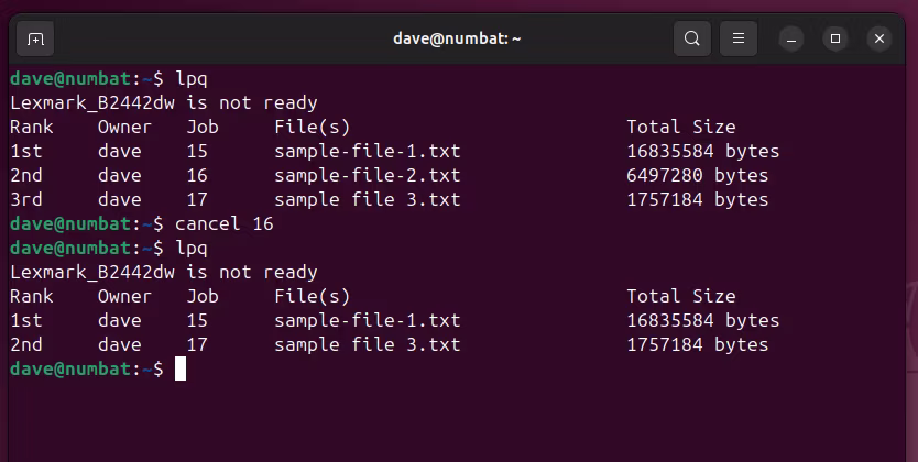 要取消打印作业,您需要知道其作业编号。您可以在 lpq 命令的输出中找到它。