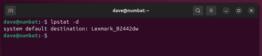 -d(默认)选项显示默认打印机。要从此命令获得有用的响应,您需要将打印机配置为默认设备。仅仅因为您只有一台打印机,并不意味着它就是默认打印机。