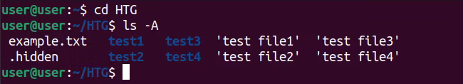在开始计算文件数之前,让我们使用 ls 命令列出 ~/HTG 目录中的实际文件。这里我们总共有十个文件,包括〜/HTG主目录中的四个子目录。有 1 个隐藏文件、1 个文本文件和 4 个测试文件。
