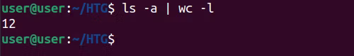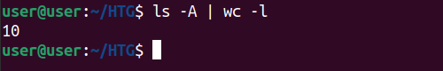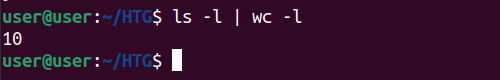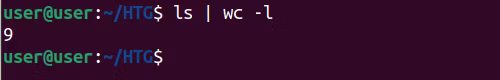 为了对 ls 命令列出的文件进行计数,我们将其输出通过管道 (|) 传送到 wc -l 命令。 wc 命令对这些列出的文件进行计数并输出文件计数。请记住此命令输出 9,因为它不包含 ~/HTG 目录中存在的一个隐藏文件。