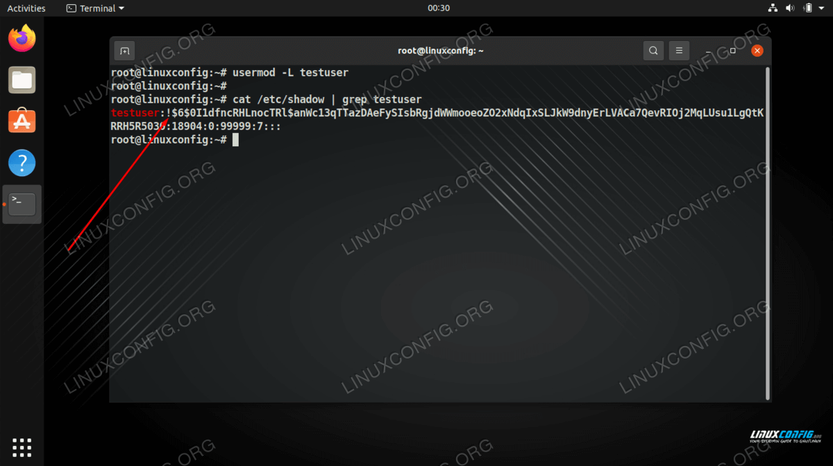选项,如下面的语法所示。在此示例中,我们为用户 linuxconfig 设置 shell。
