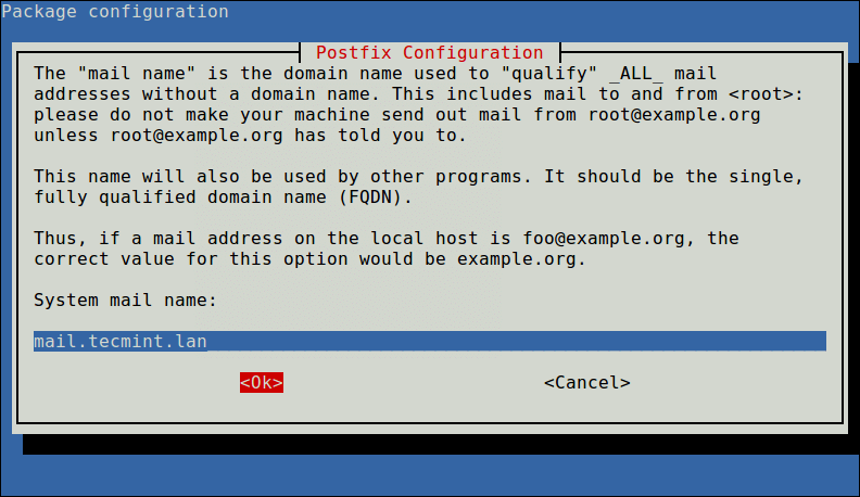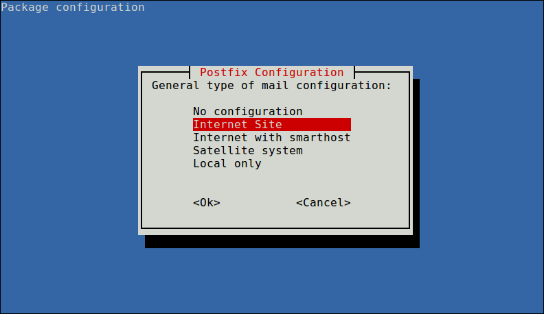 在 Postfix 安装过程中,系统会要求您配置 Postfix 软件包。选择“互联网站点”并点击[Enter]。请记住使用服务器的外部 DNS 作为“邮件名称”,然后按[Enter]。对于任何额外的配置屏幕,请按 [Enter] 使用 接受默认值。