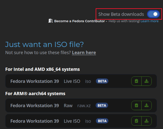 您可以从常见的 Fedora Workstation 页面下载测试版。您需要滑动“显示测试版下载”滑块按钮以显示测试版下载。