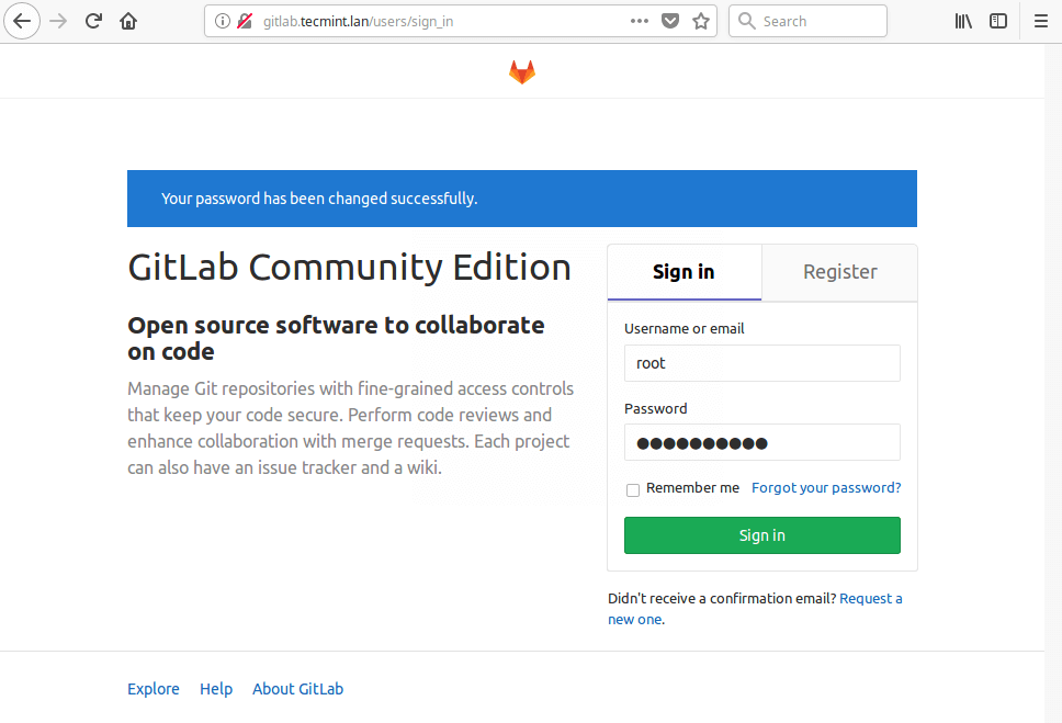 6. 现在,打开 Web 浏览器并使用您在安装过程中设置的以下 URL 访问您的 gitlab 实例。