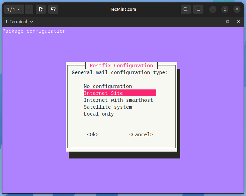 在 Postfix 安装过程中,可能会出现一个配置窗口。选择“互联网站点”并使用服务器的外部 DNS 作为“邮件名称”,然后按 Enter 键。如果出现额外的屏幕,请继续按 Enter 键接受默认值。
