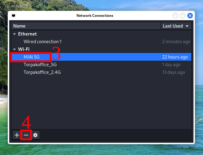 选择要删除密码的网络,然后单击“-”(减号)符号形式的“删除所选连接”图标。