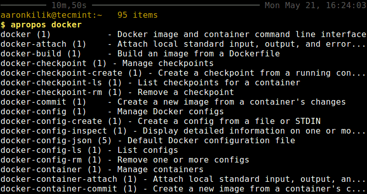 如果您不知道命令的确切名称,只需键入关键字(正则表达式)即可搜索它。例如,如果您要搜索docker-commit命令的描述,您可以输入docker,apropos将搜索并列出所有带有字符串docker的命令,以及它们的命令。描述也是如此。
