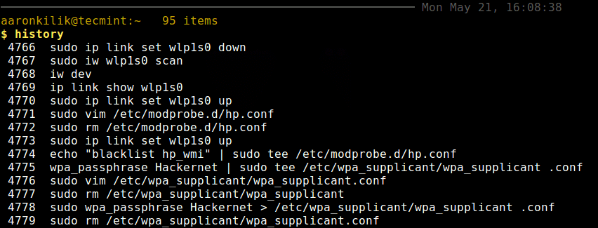 要查看 bash 历史记录,请使用如下所示的历史命令。