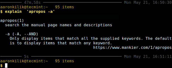 假设你忘记了命令“apropos -a ”的作用,你可以使用explain命令来帮助你记住它,如图所示。