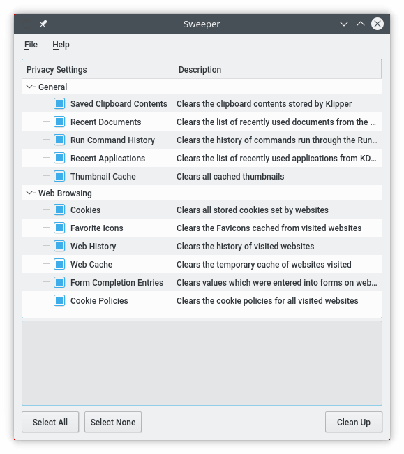 Sweeper 是 KDE 的一个简单且默认的系统清理器,用于清理系统上不需要的用户活动痕迹,以保护您的隐私并通过删除未使用的临时文件来回收磁盘空间。