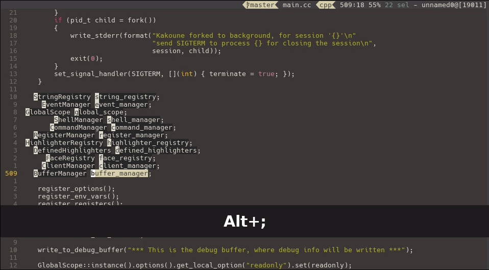 它配备了许多文本编辑/编写工具,支持语法突出显示、打字时自动完成,并支持许多不同的编程语言。它还实现了多重选择作为与文本交互的基本过程。此外,Kakoune 的客户端/服务器架构允许协作代码编辑。