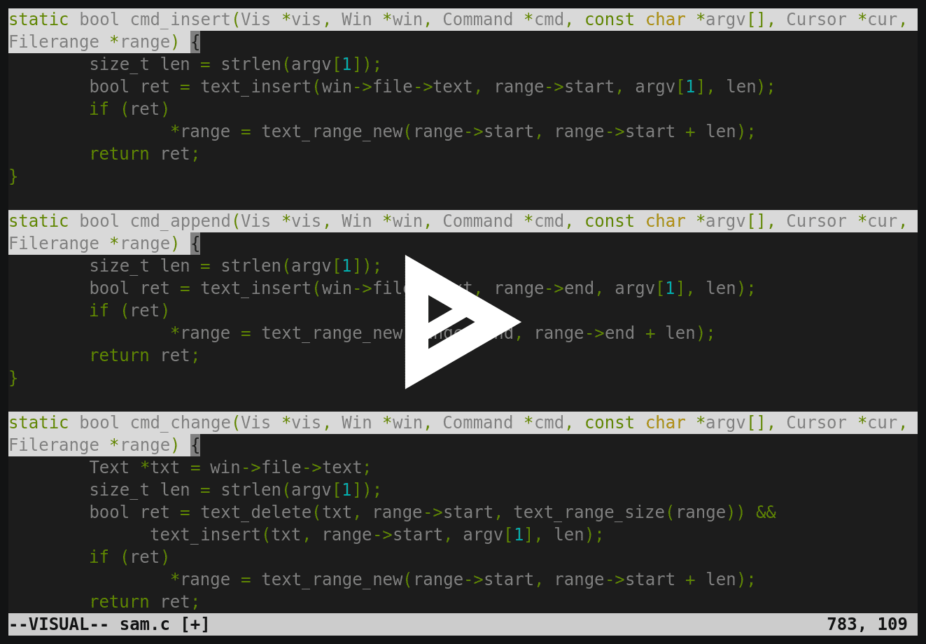 Vis 是一个免费的开源、类似 Vi 的代码编辑器,它通过内置支持多个光标/选择来扩展 vi 的模式编辑,这些光标/选择是使用同一编辑器基于结构正则表达式的命令语言实现的。