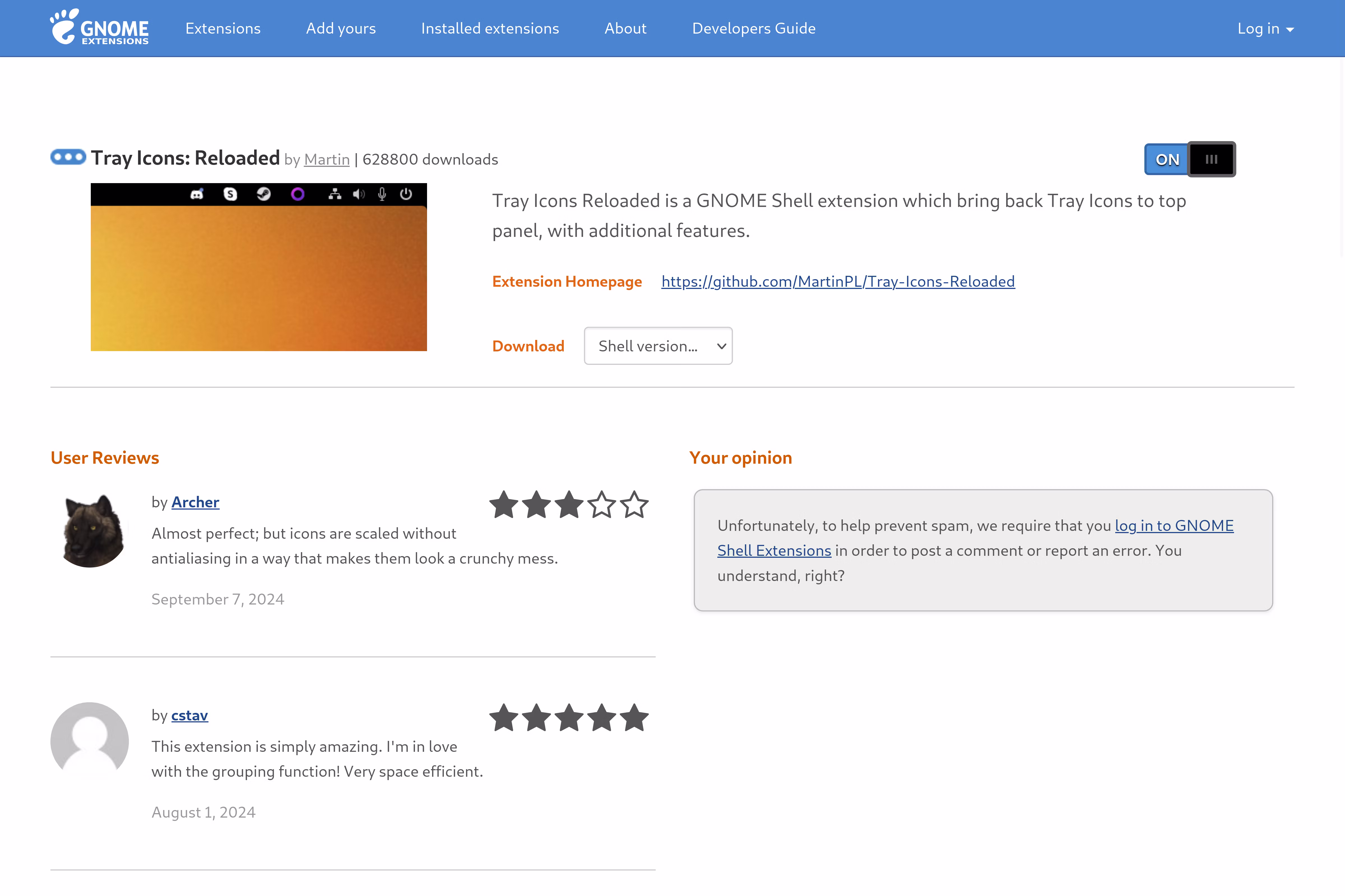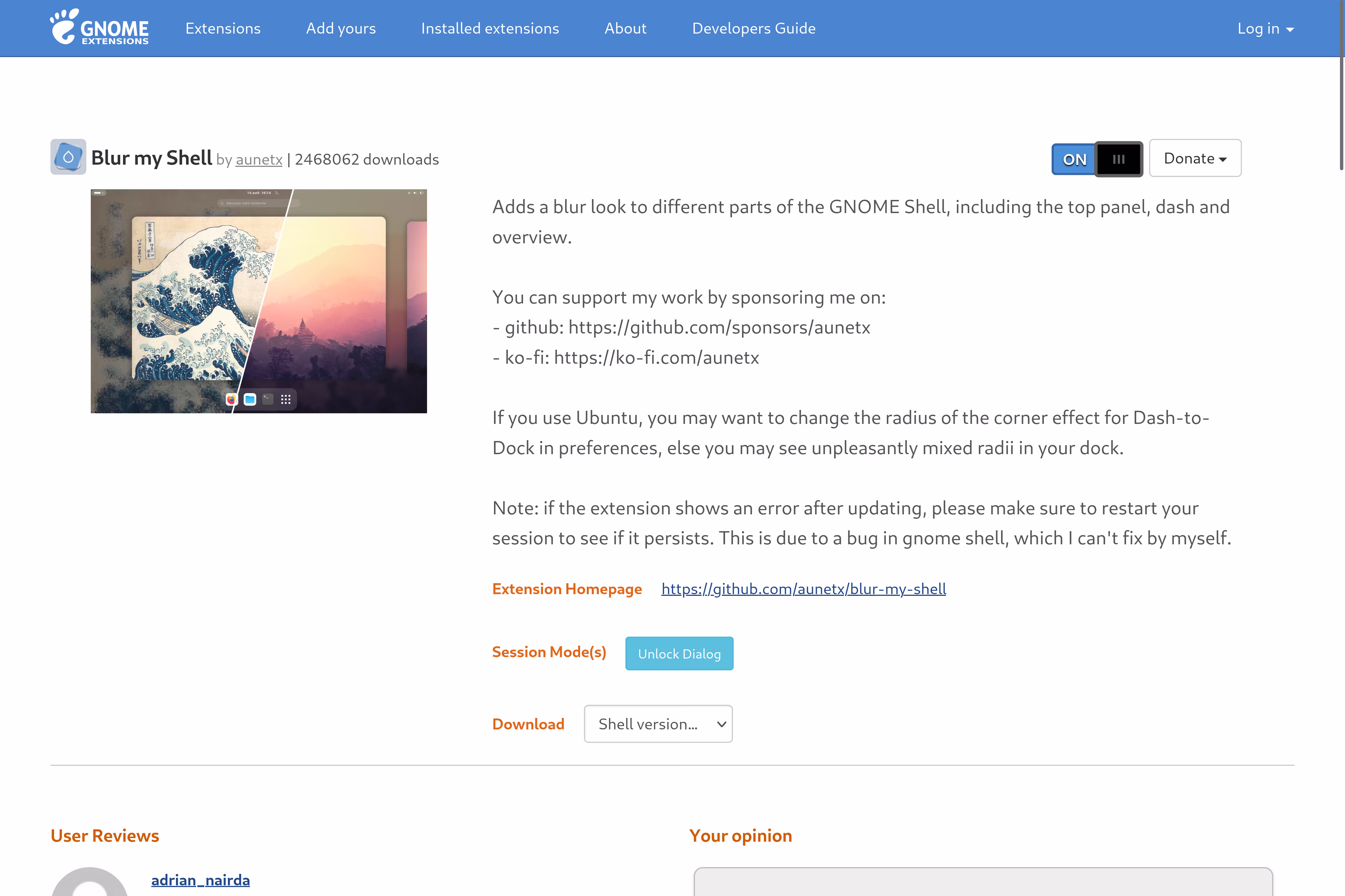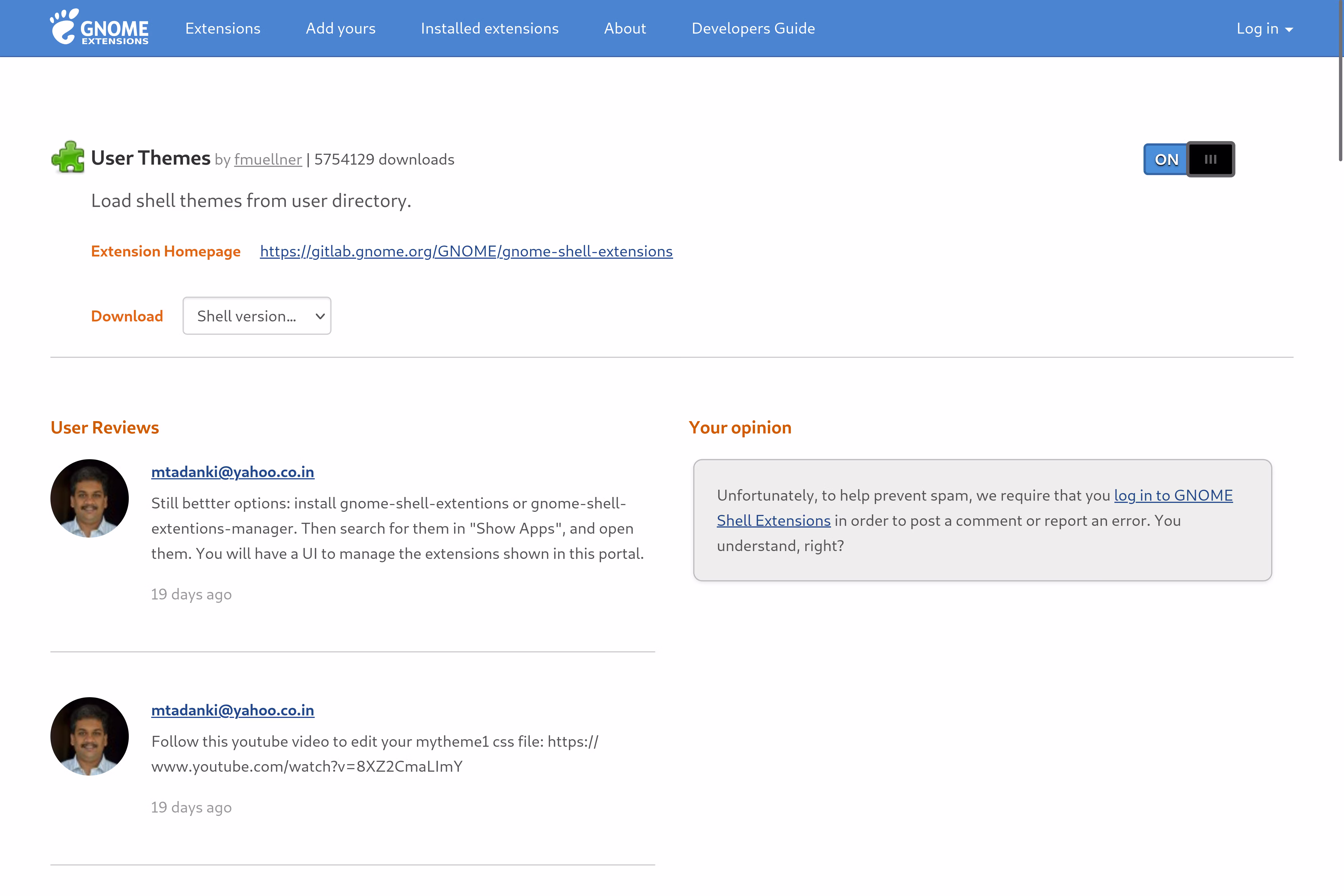 安装扩展后,请访问此网站:extensions.gnome.org。从这里,您可以开始在 Ubuntu PC 上下载扩展,然后可以通过我们之前安装的 GNOME 扩展应用程序进行管理。您应该下载的第一个扩展是用户主题。它可以让您在不同的主题之间切换,以改变图形外观和美感。您可以通过单击右上角区域的开/关切换来安装扩展。