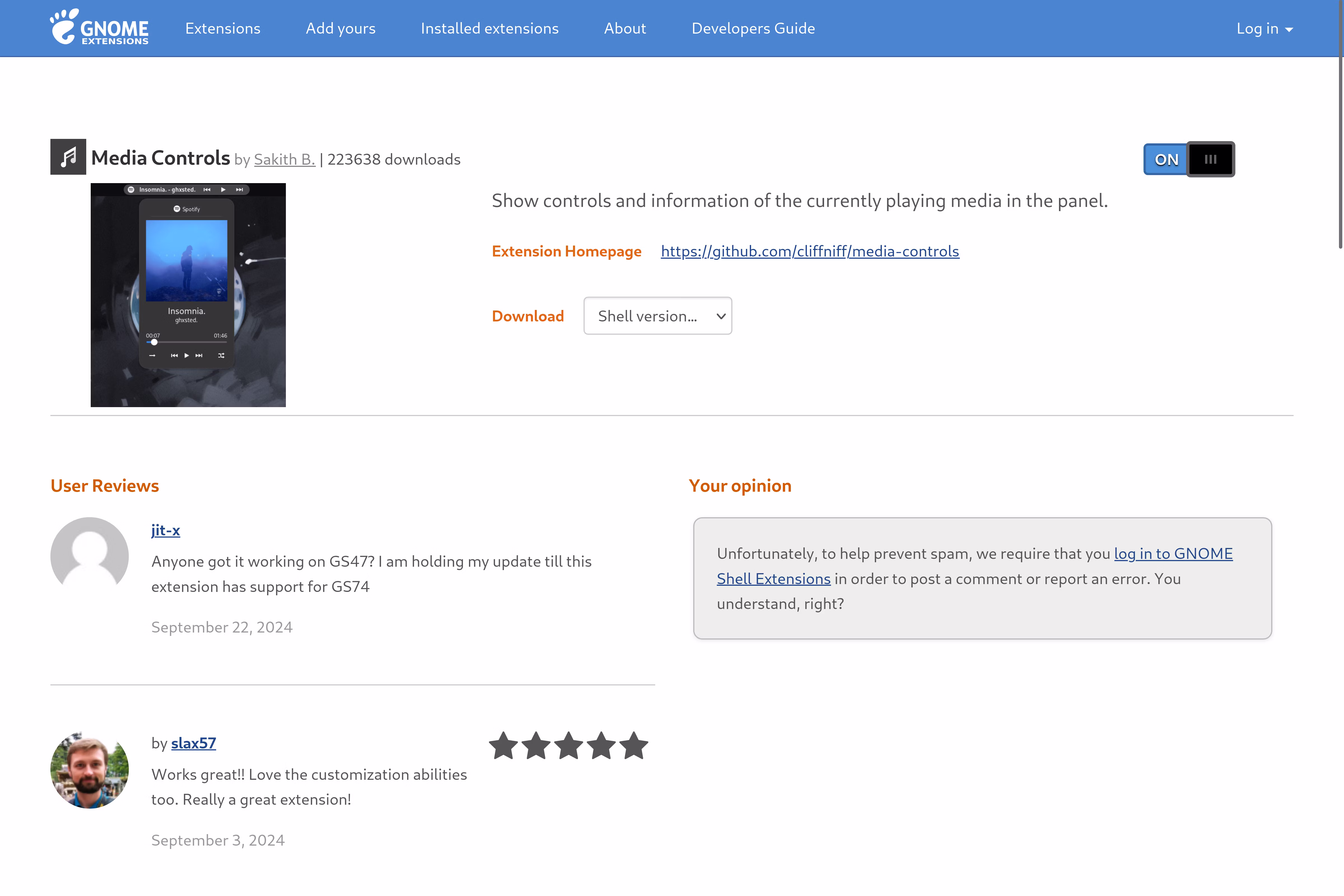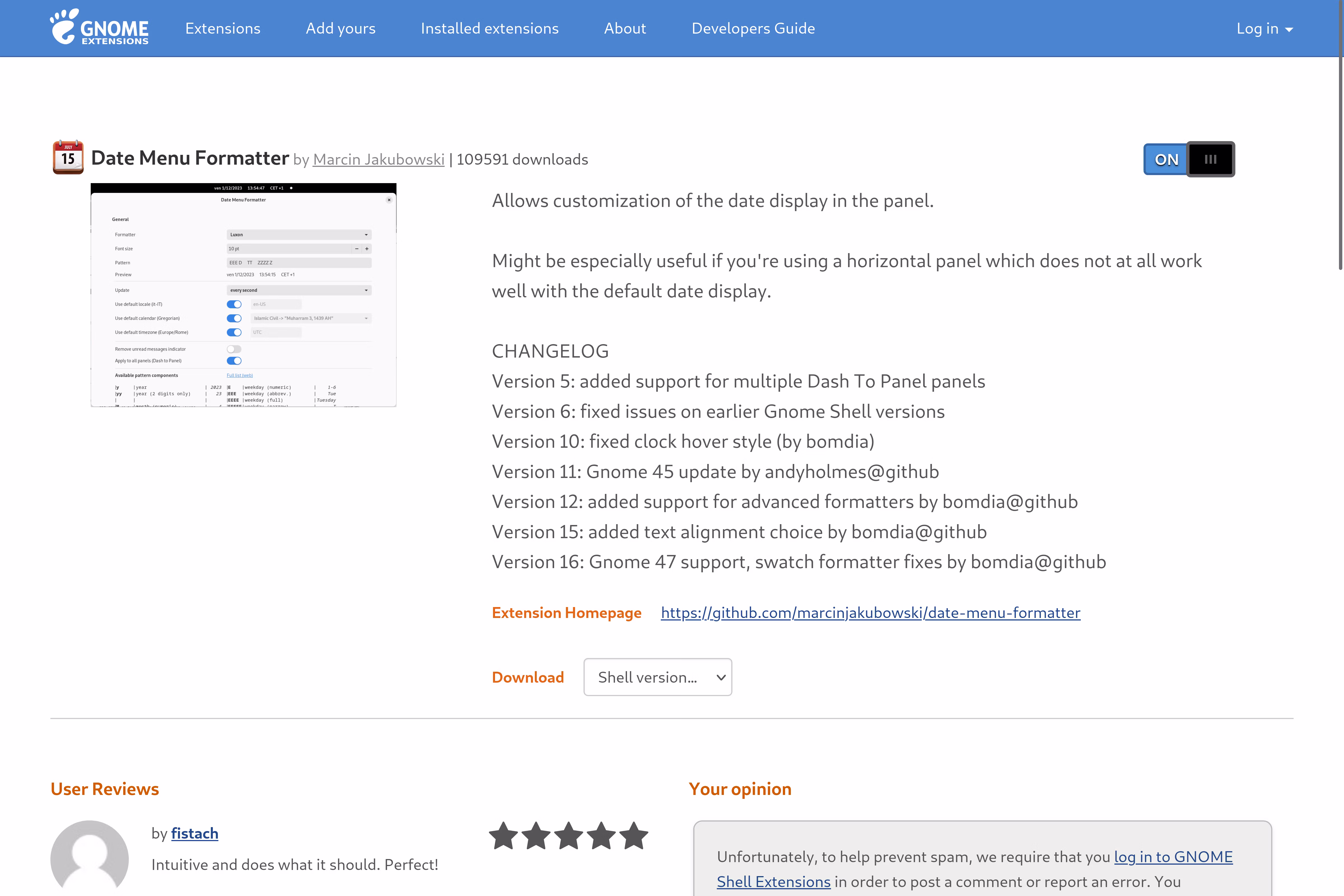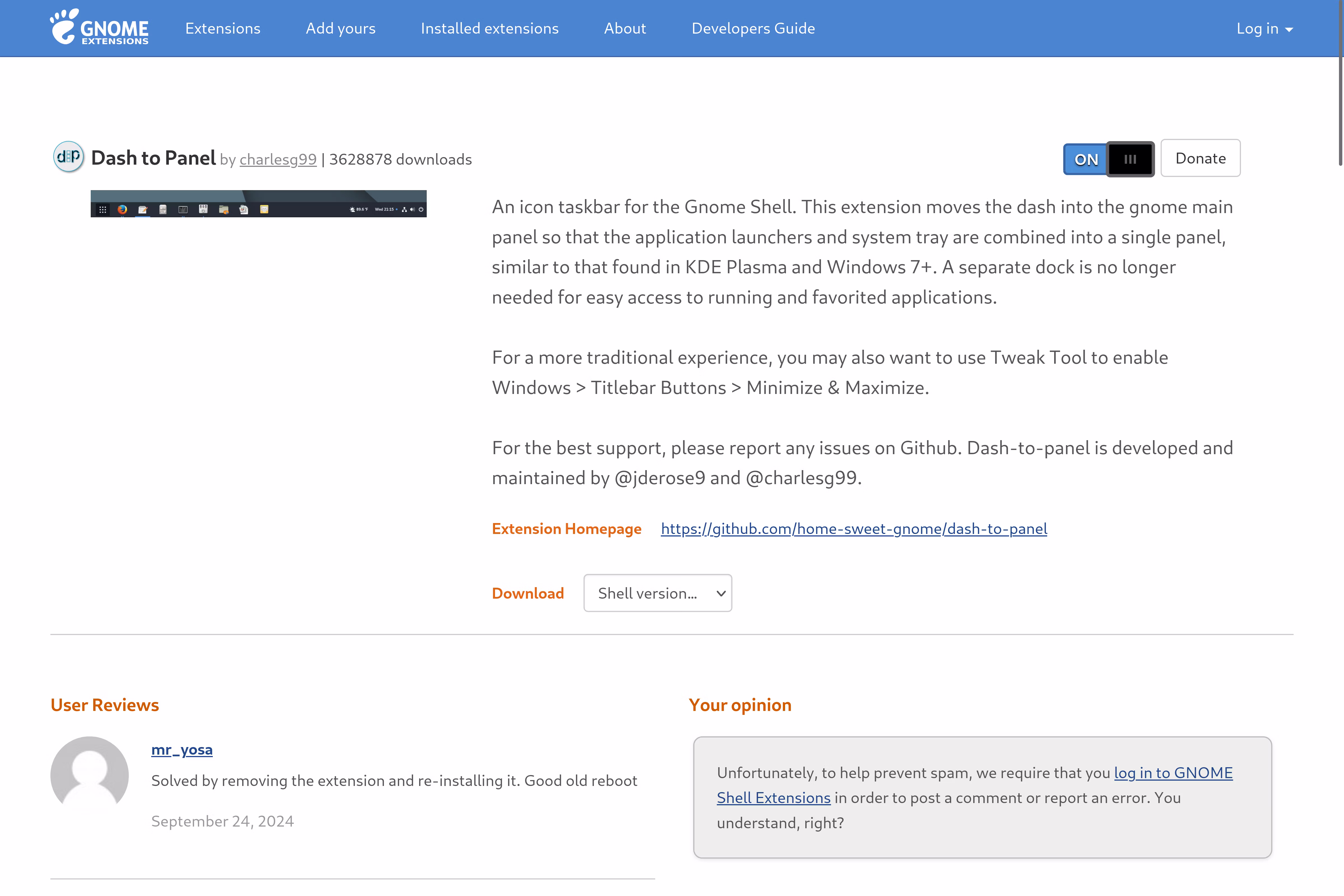 安装扩展后,请访问此网站:extensions.gnome.org。从这里,您可以开始在 Ubuntu PC 上下载扩展,然后可以通过我们之前安装的 GNOME 扩展应用程序进行管理。您应该下载的第一个扩展是用户主题。它可以让您在不同的主题之间切换,以改变图形外观和美感。您可以通过单击右上角区域的开/关切换来安装扩展。