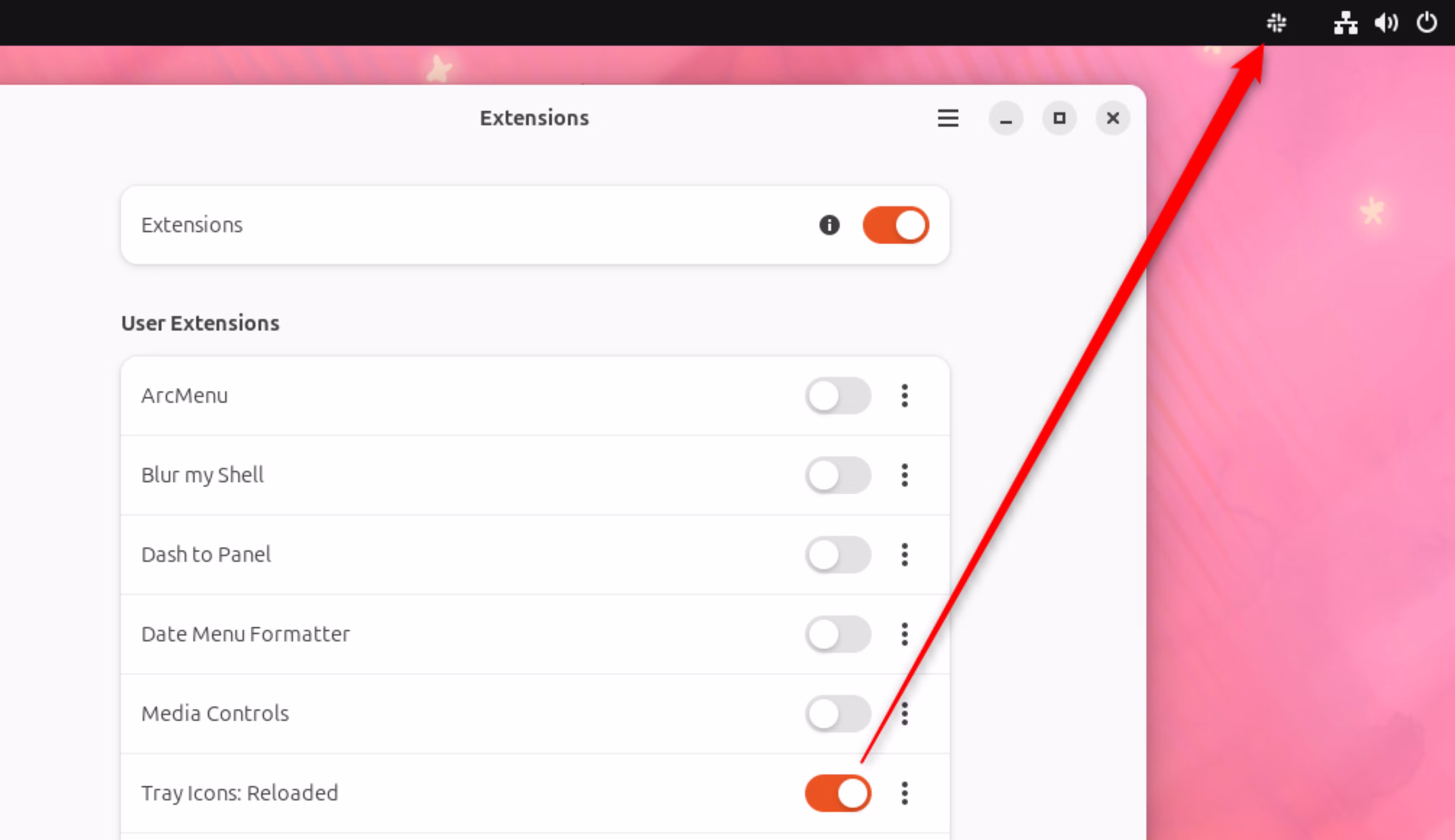 最后,您可能已经注意到 Ubuntu 不会在其面板上显示后台运行的应用程序。为了解决这个问题,我们将安装“托盘图标:重新加载”。