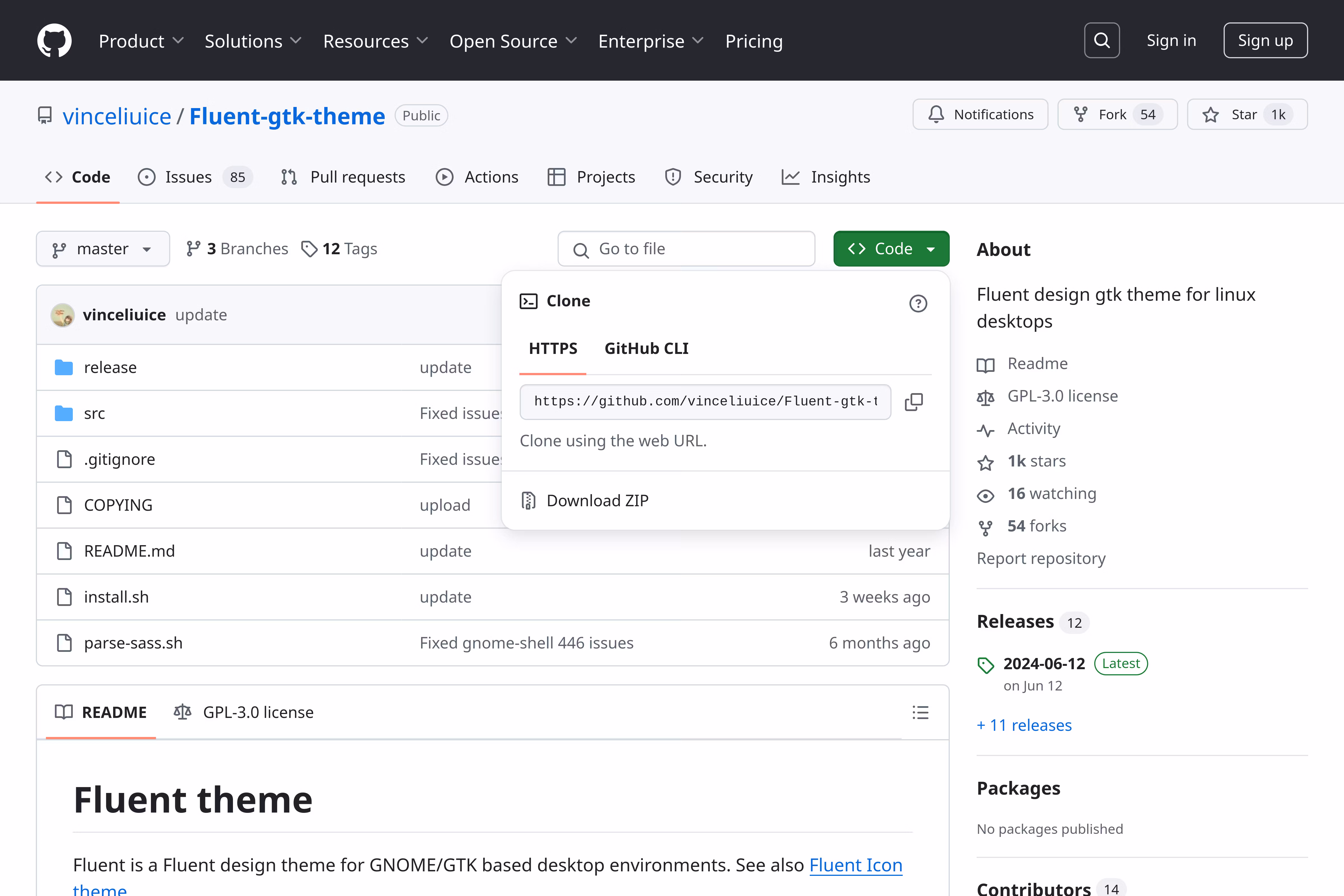 我还测试了很多 GNOME 主题,发现 Fluent GTK 主题最像 Windows。要安装它,您可以访问其 GitHub 页面,复制其远程存储库 URL(在“代码”菜单中找到),然后将其克隆到您的系统上。