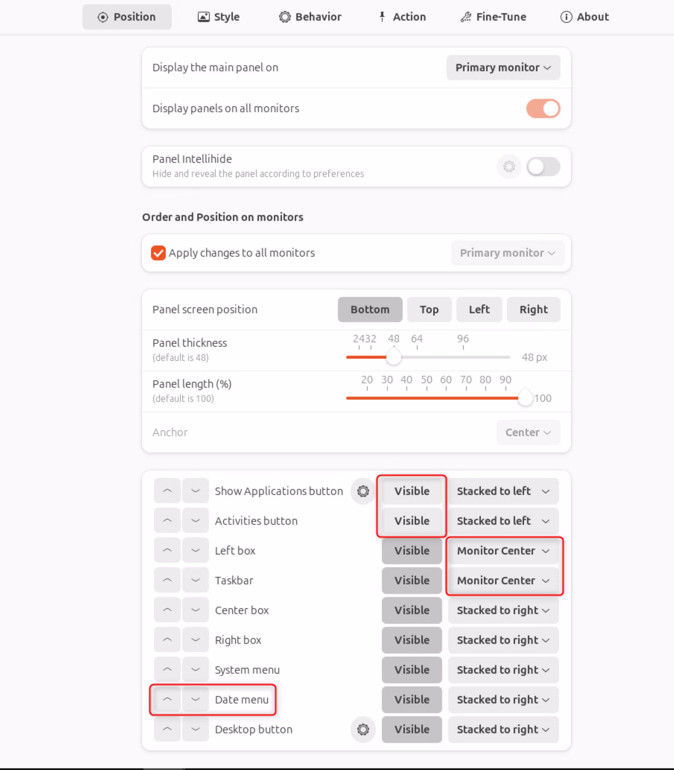 让我们从 Dash to Panel 开始。进入其设置并进行以下更改: