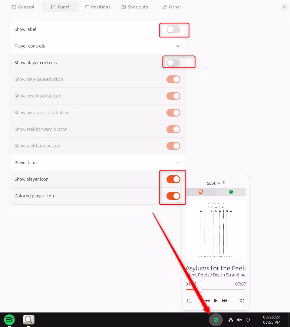 最后,对于媒体控件,前往“面板”选项卡并禁用“显示标签”和“显示播放器控件”。这将在任务栏上为您提供一个专用的媒体控制按钮,您可以单击该按钮来控制媒体播放。