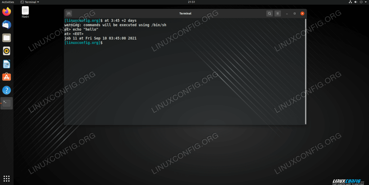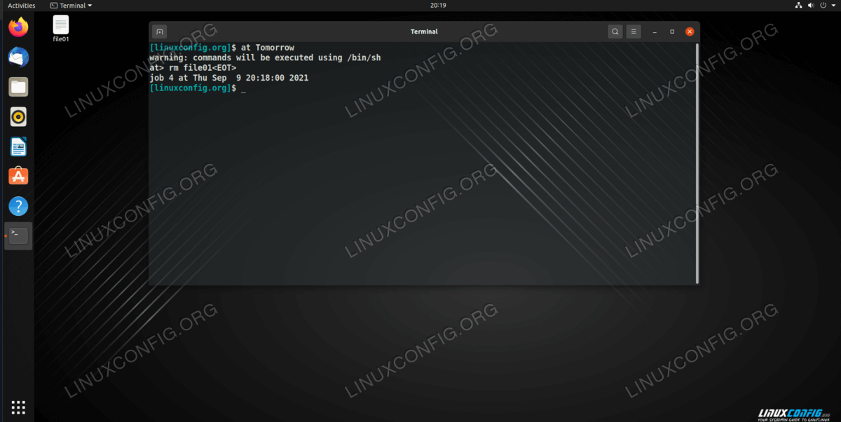 并在下面显示的提示中键入所需的命令。 at 还会警告命令将在哪个 shell 中运行。$ at tomorrow at> rm file01