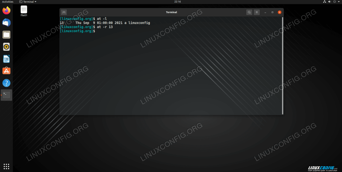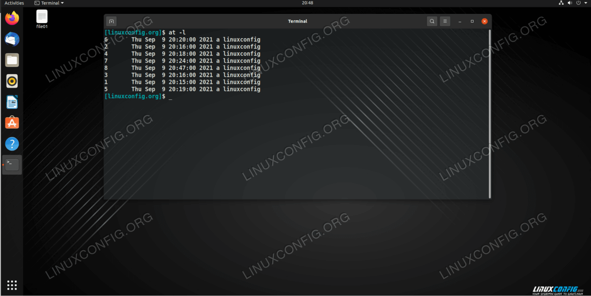 选项和 at 在列表中自由查看所有作业。或者,您可以简单地运行atq命令来达到相同的效果。$ at -l