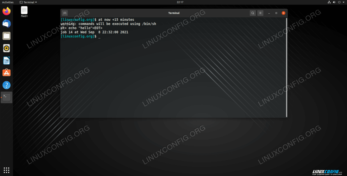 ,然后在其后添加分钟或小时。$ at now +15 minutes at>echo “hello”