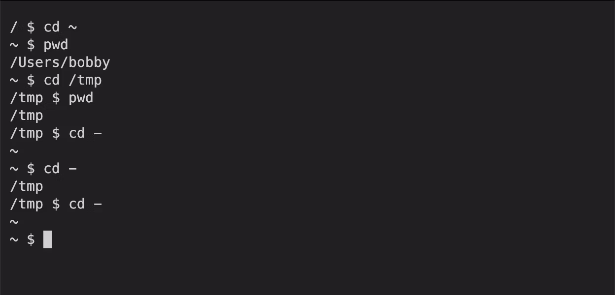 每次运行“cd -”时,它都会在您导航到的前两个目录之间切换,从而使来回移动变得非常快速且轻松。