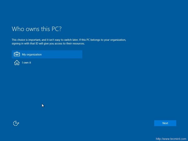 15.然后安装程序想知道谁拥有这台机器“我的组织”还是我自己。选择“我拥有它”,然后下一步。