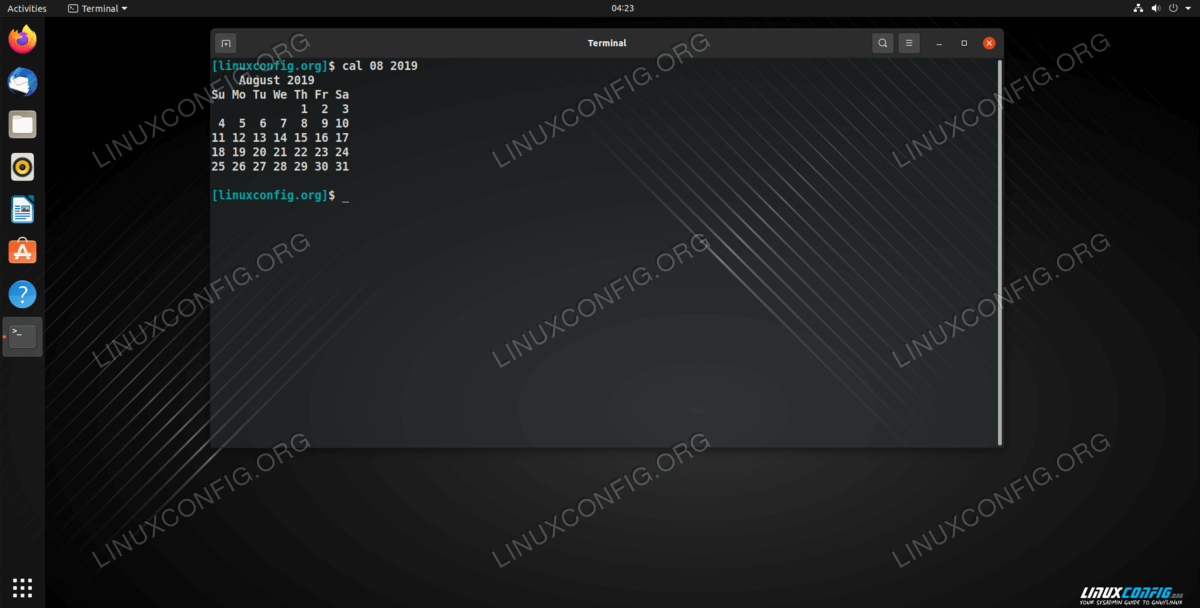 我们可以使用上面示例中的语法来打印特定月份和年份的日历,在我们的示例中为 2019 年 8 月。您可能已经注意到,此输出的日历中没有突出显示的日期。这是因为 cal 命令仅突出显示当前日期,我们的示例中不包括该日期。