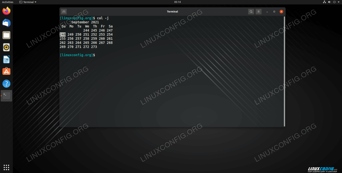 6. 我们还可以使用 cal 命令以与默认格鲁吉亚日历格式不同的日历格式为我们打印当前月份的日历。当使用 -j 命令行选项运行 cal 命令时,它将以儒略历格式在当前月份的输出中打印日历。儒略历格式将列出每个月的每一天,从 1 数到 365,而不是每个月后重置为 1。这对于快速查看自特定日期以来一年中已经过去了多少天特别有用。