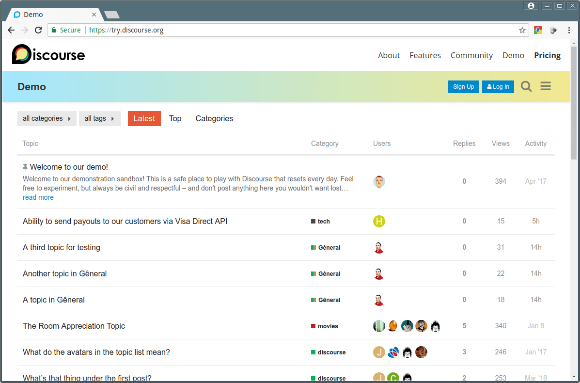 它具有响应能力(自动切换到小屏幕的移动布局),并且支持动态通知、社区审核、社交登录、垃圾邮件拦截、通过电子邮件回复、表情符号和徽章。它还配备了信任系统等等。