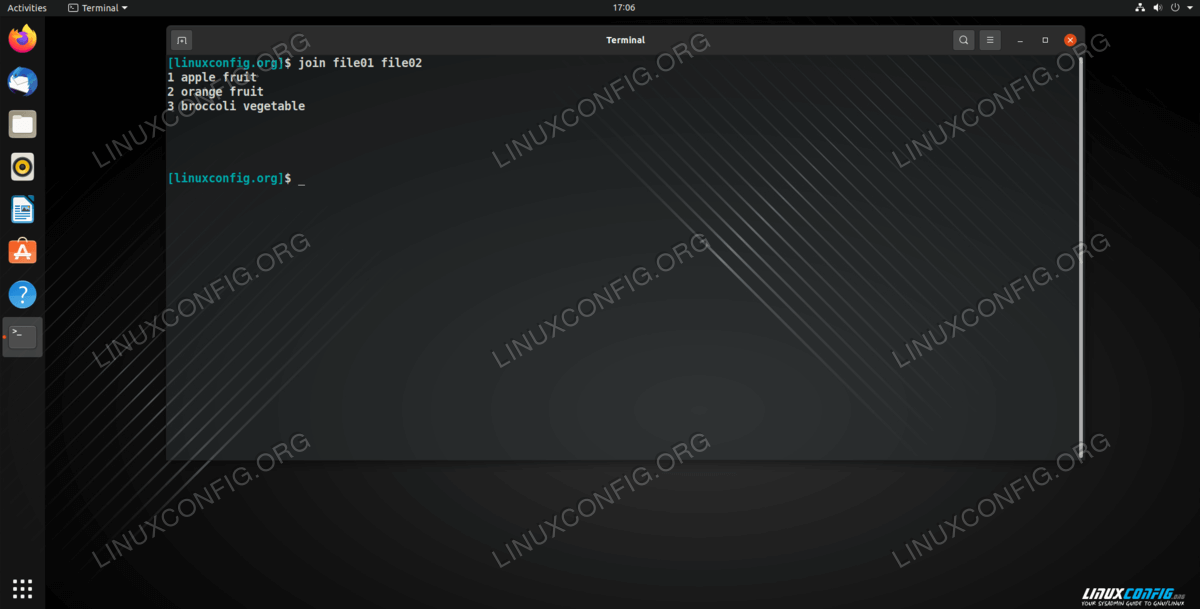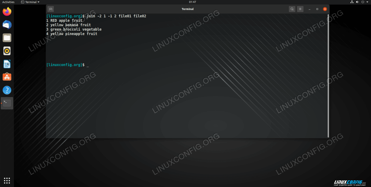 1. 单独运行 join 命令(无需任何其他选项)会将命令行中指定的文本文件与匹配的联接字段合并。 join 命令默认使用的字段是每个文本文件的第一行。在下面的示例中,我们将使用两个包含食物及其食物类型的文本文件。我们将其命名为 file01 和 file02。