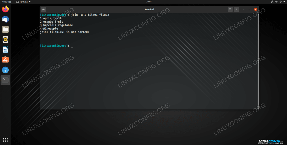 正如您在上面的屏幕截图中看到的,join 的输出合并了 file01 和 file02,但仅打印可以匹配的 3 行。这是因为,如继续输出的错误消息中所述,缺少行的文本文件未排序。