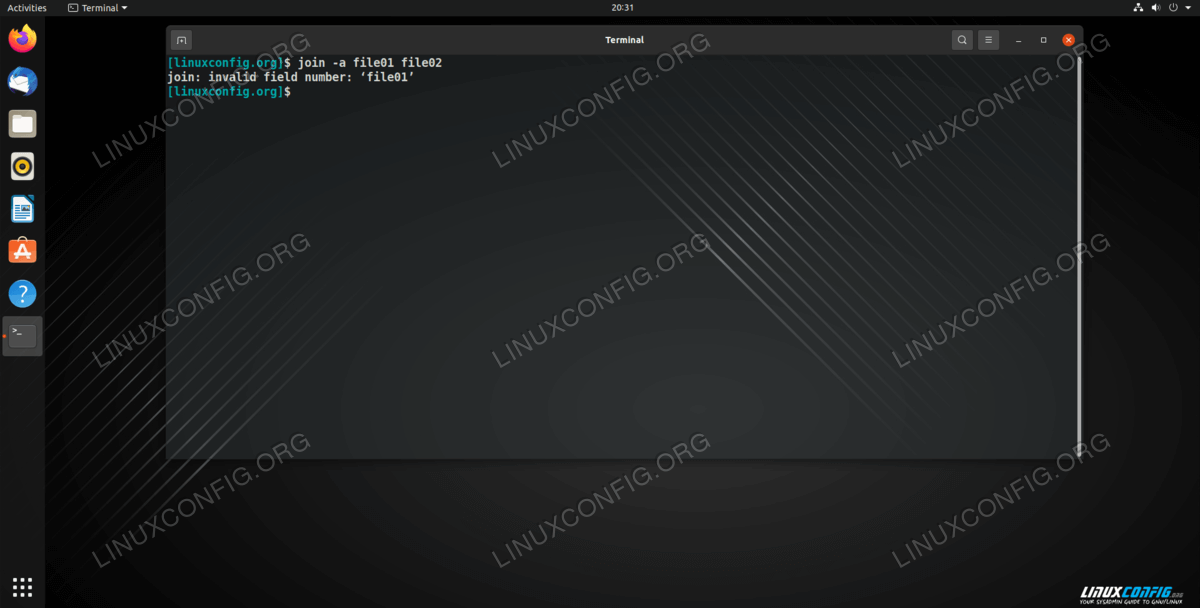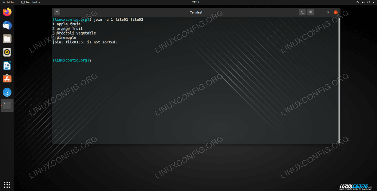 2. 如果您要与另一个文本文件合并的其中一个文本文件缺少要使用 join 命令(不带其他选项)合并的行,则输出将打印一条错误,指出文件未排序。因此join不会处理两个文件中的该行。如果这看起来有点令人困惑,那么从下面的示例屏幕截图中会更清楚。
