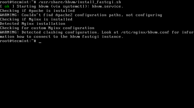 为了使 Nginx 与 HHVM 对话,我们需要运行以下包含脚本,该脚本将通过在 nginx 配置的开头放置 hhvm.conf 来正确配置 nginx,如上所述。