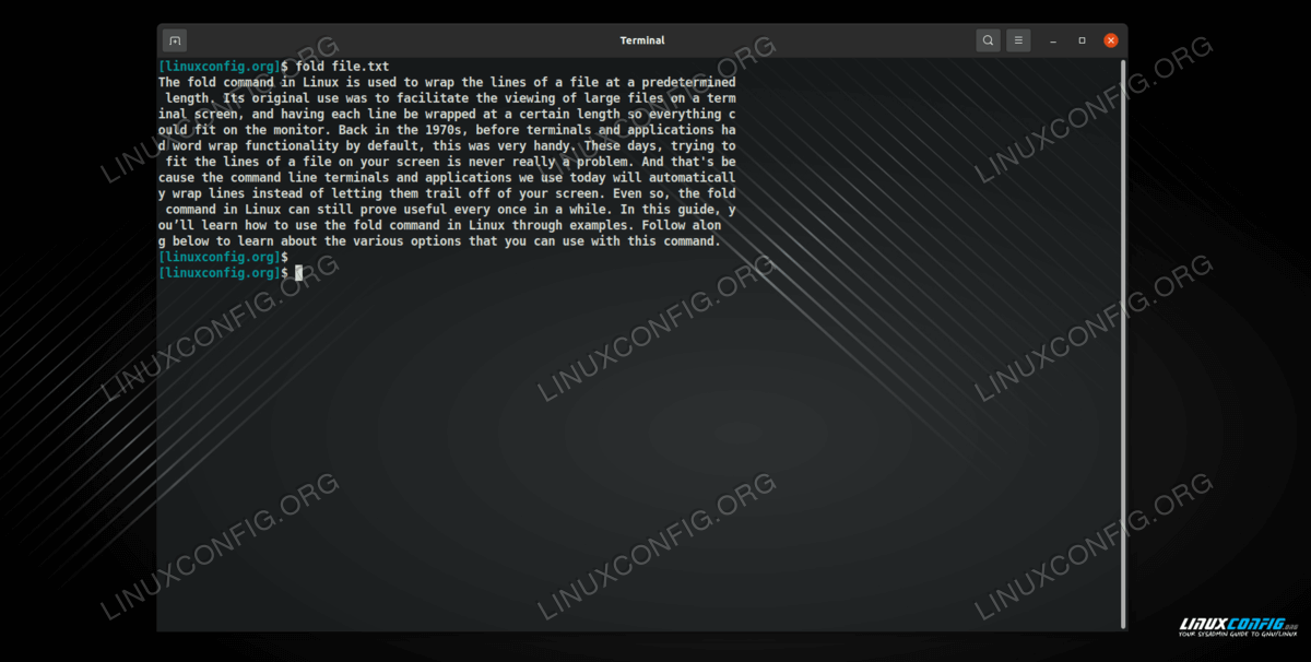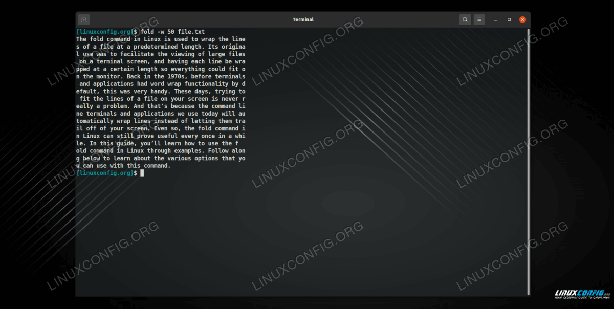 您始终可以使用 man 命令来阅读有关 fold 命令及其官方文档的更多信息。单击上一个链接可查看如何打开 Linux 系统上任何命令的手册页。