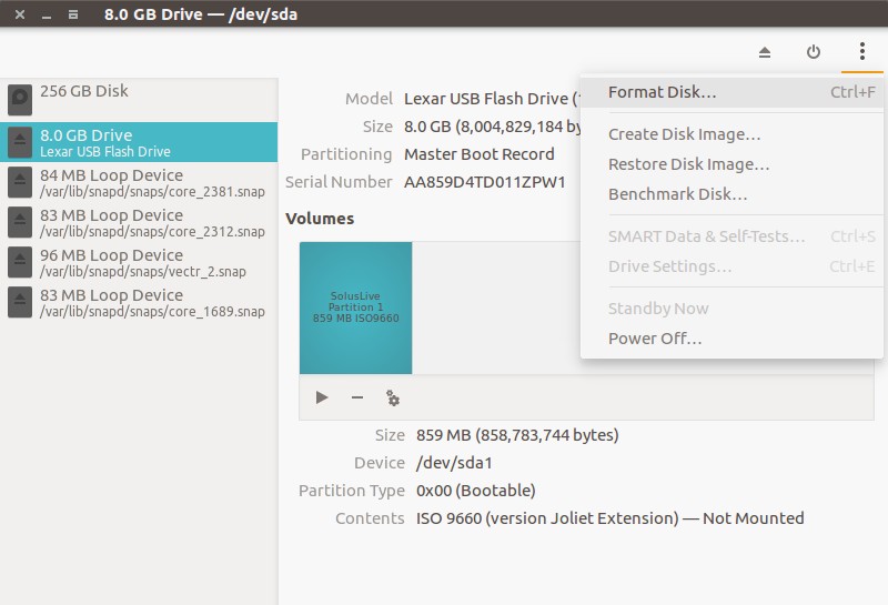 我尝试格式化的 USB 磁盘之前曾用作 Solus Linux 的实时 USB。显然,Ubuntu 对此不太高兴(双关语)。