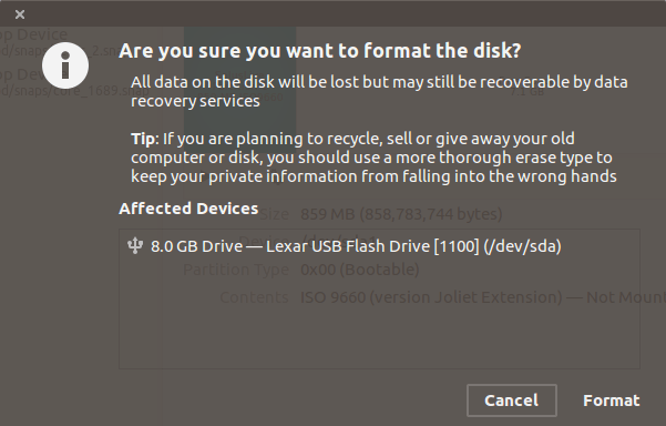 所以我尝试在Ubuntu中格式化U盘。我用的是正常的方式格式化USB。我右键单击已安装的 USB,然后单击格式化磁盘。它向我发出了有关数据丢失的常见警告,接下来我看到的是以下错误消息: