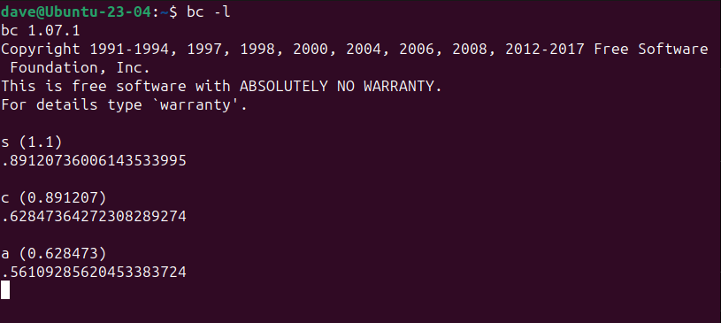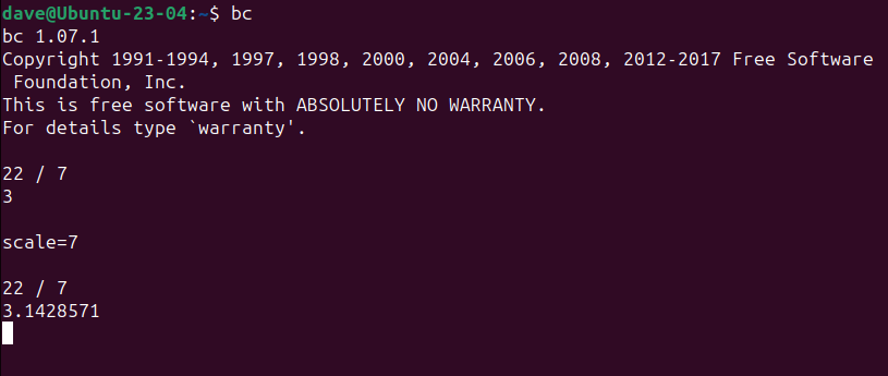 终于,我们有所进展了。 “比例”设置将保持不变,直到您更改它为止。设置小数位数告诉 bc 要显示的最大位数。如果答案不需要那么多小数位,则会显示所需的小数位数,不再显示更多。它不会被无意义的零填充。