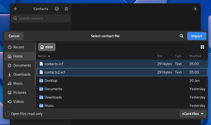 联系人应用程序允许您选择多个 VCard 文件进行导入。确认对话框会显示要导入的联系人的姓名。